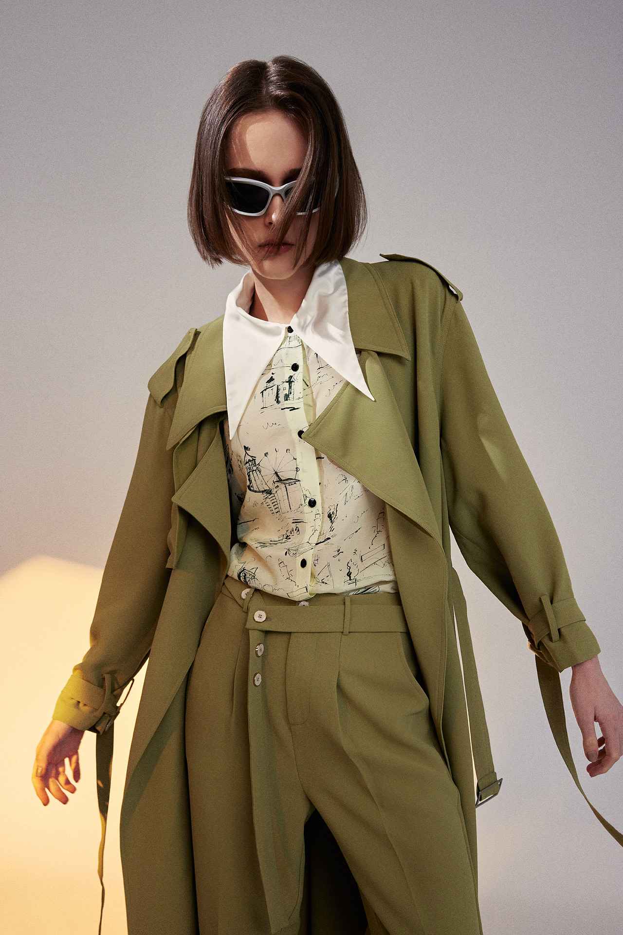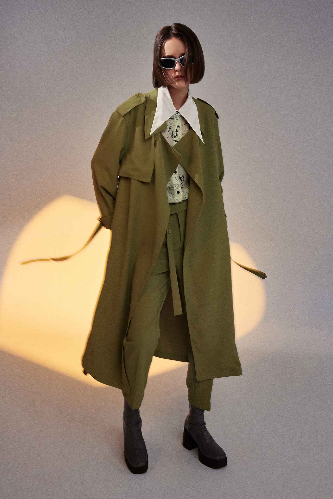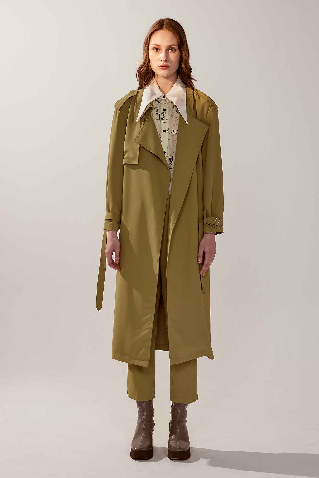 率性軍綠色寬鬆長版風衣外套(附腰帶) | JZNANA時尚購物集合