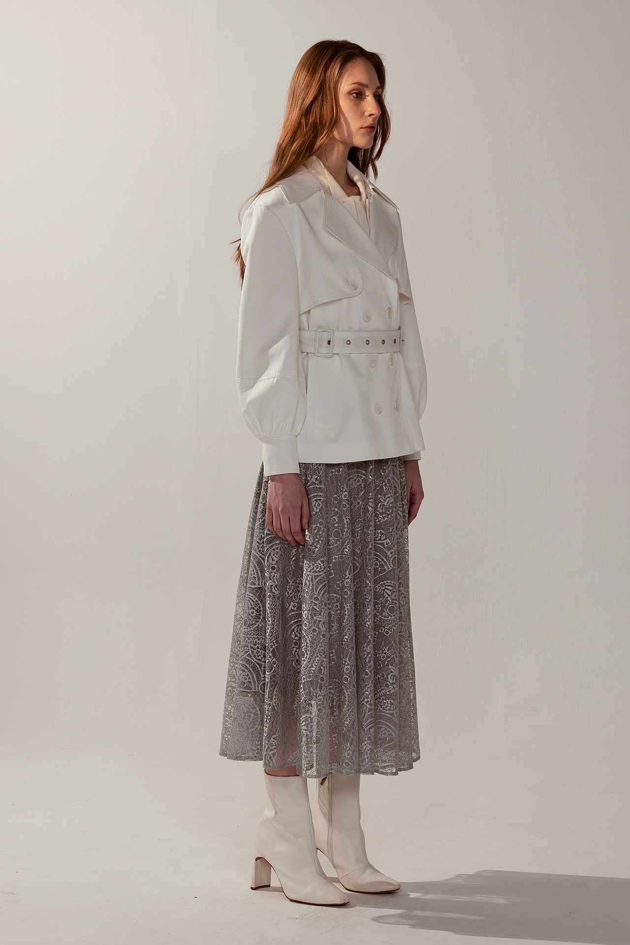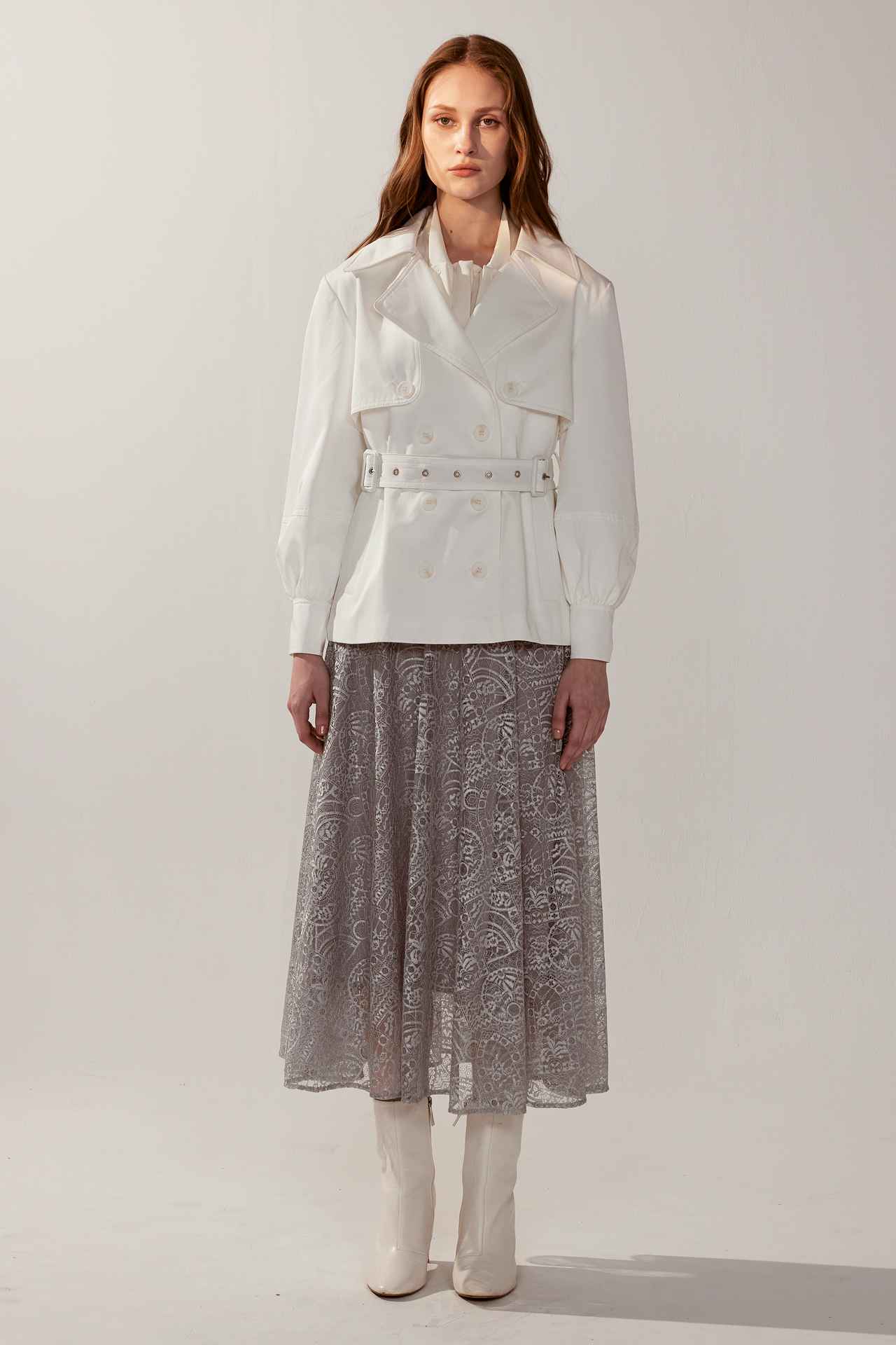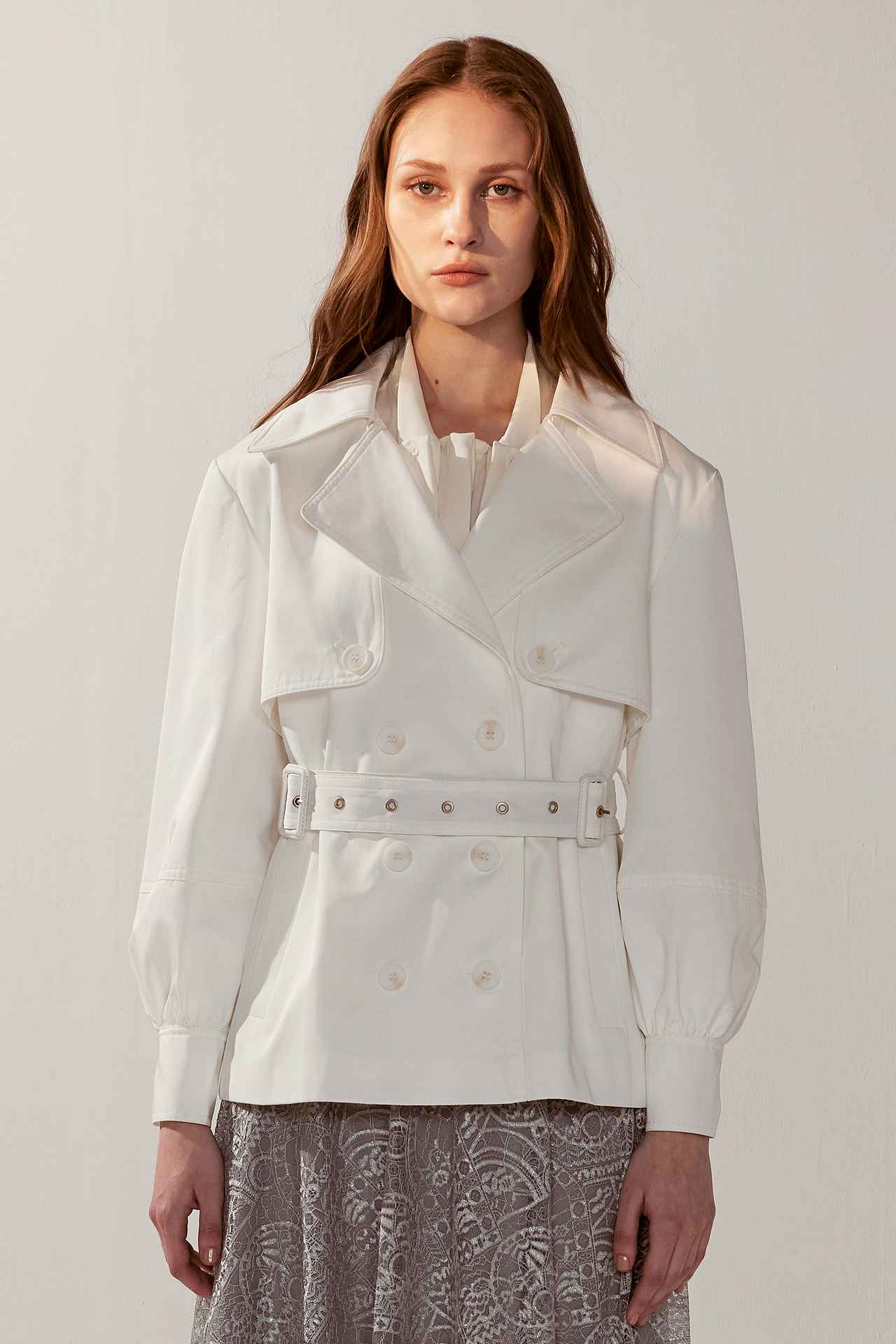 純白雙排釦翻領澎袖短版風衣外套(附腰帶) | JZNANA時尚購物集合