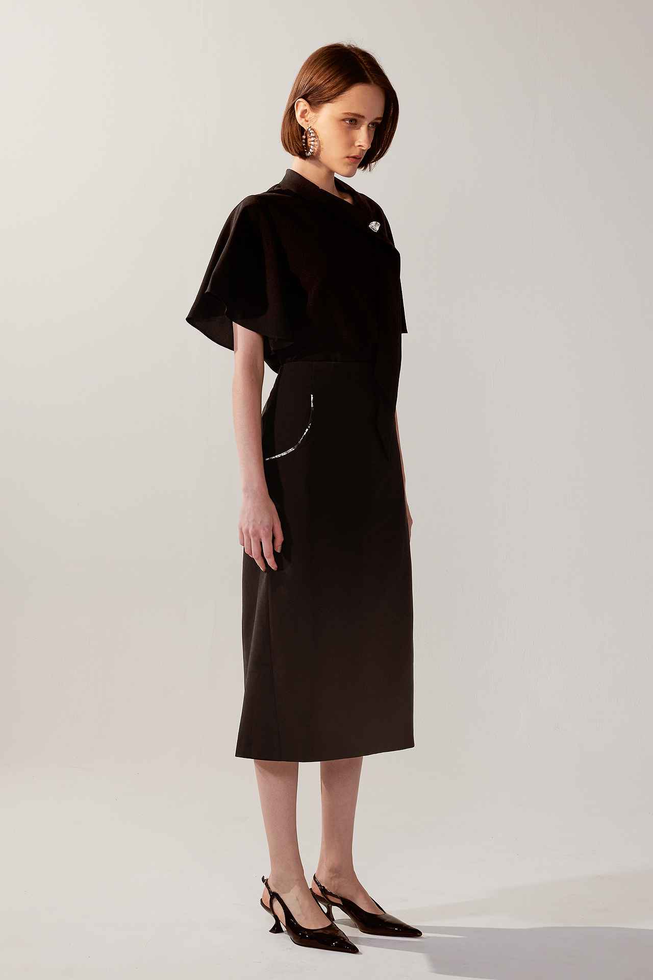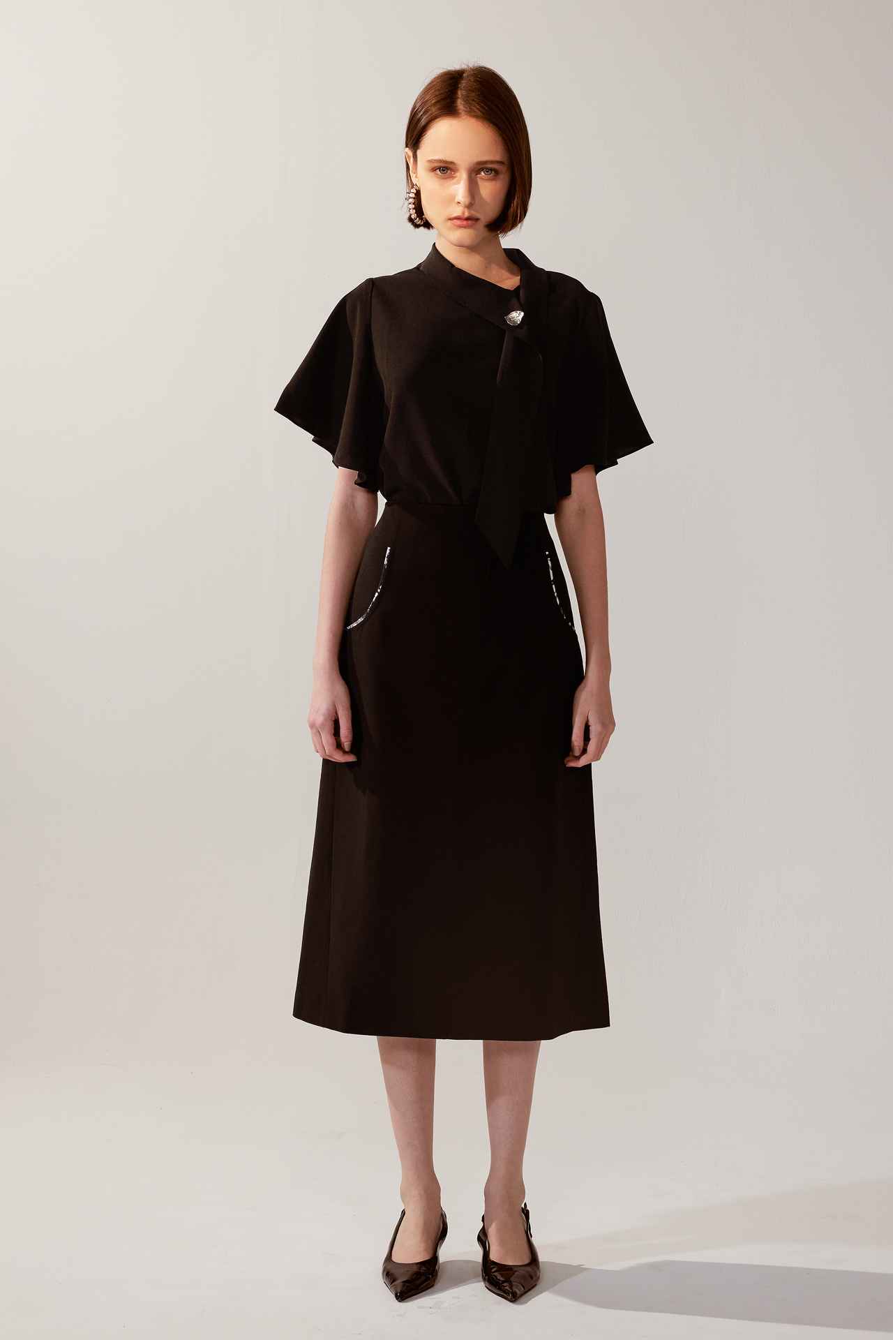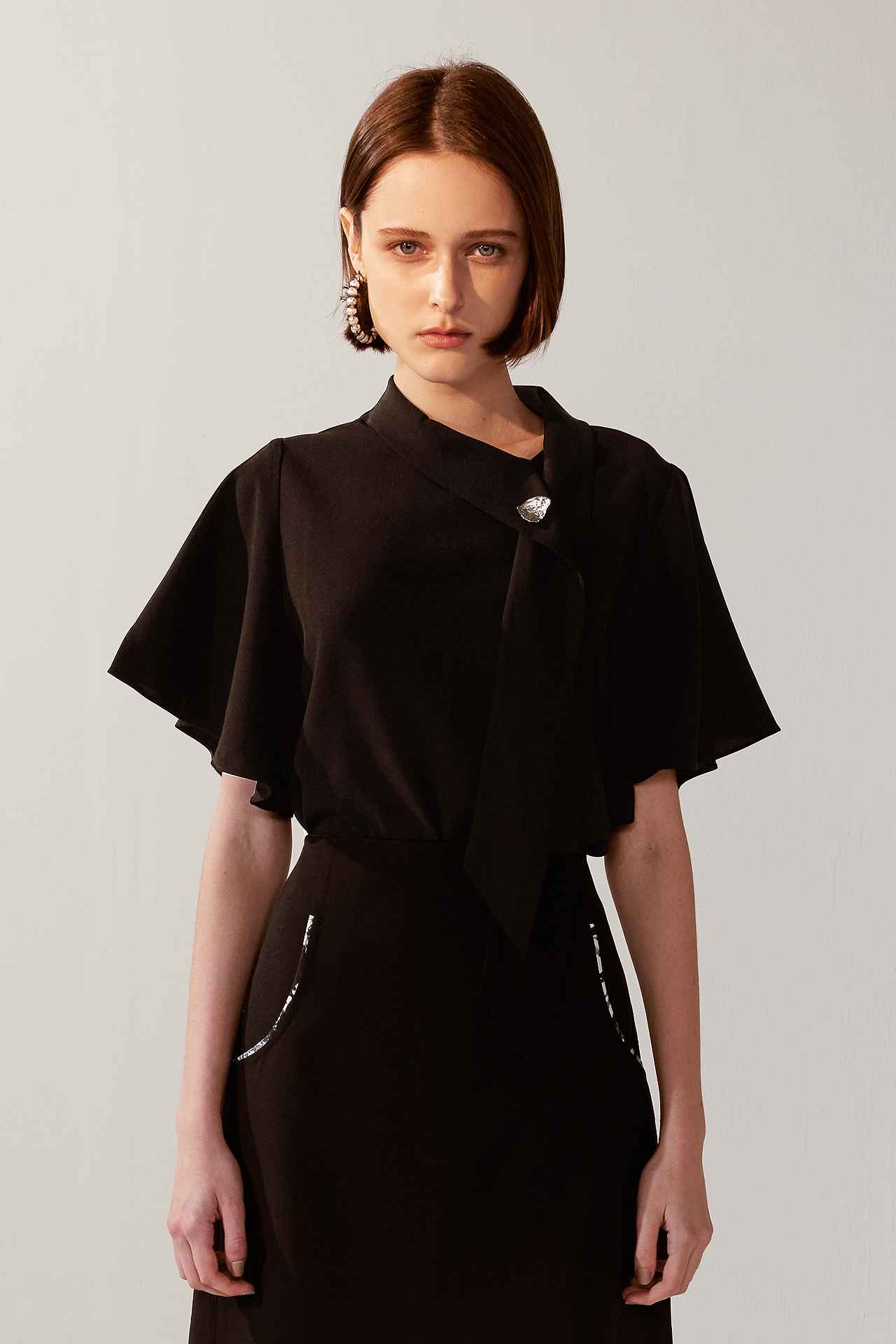 率性銀釦斜領荷葉袖領帶上衣 | JZNANA時尚購物集合