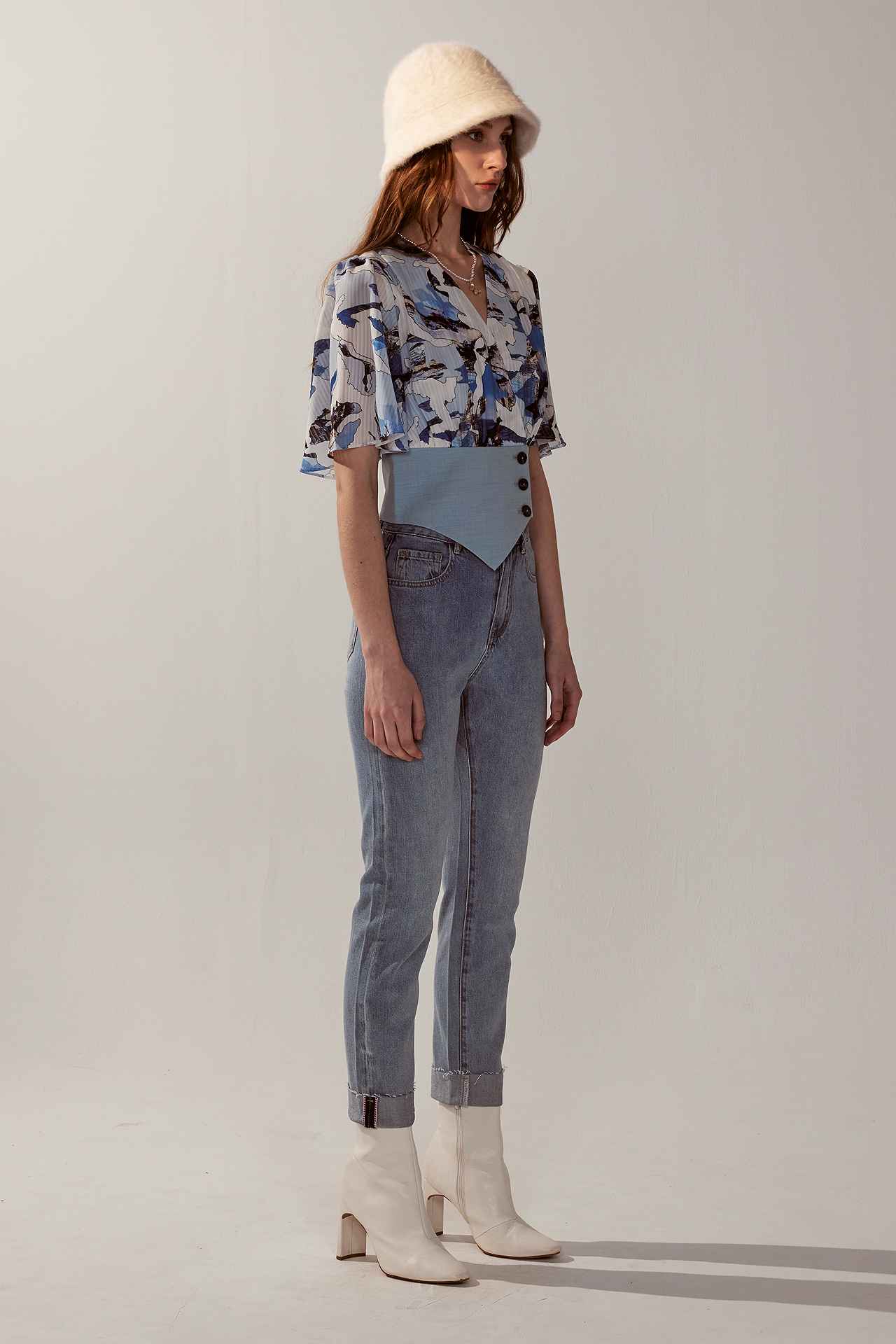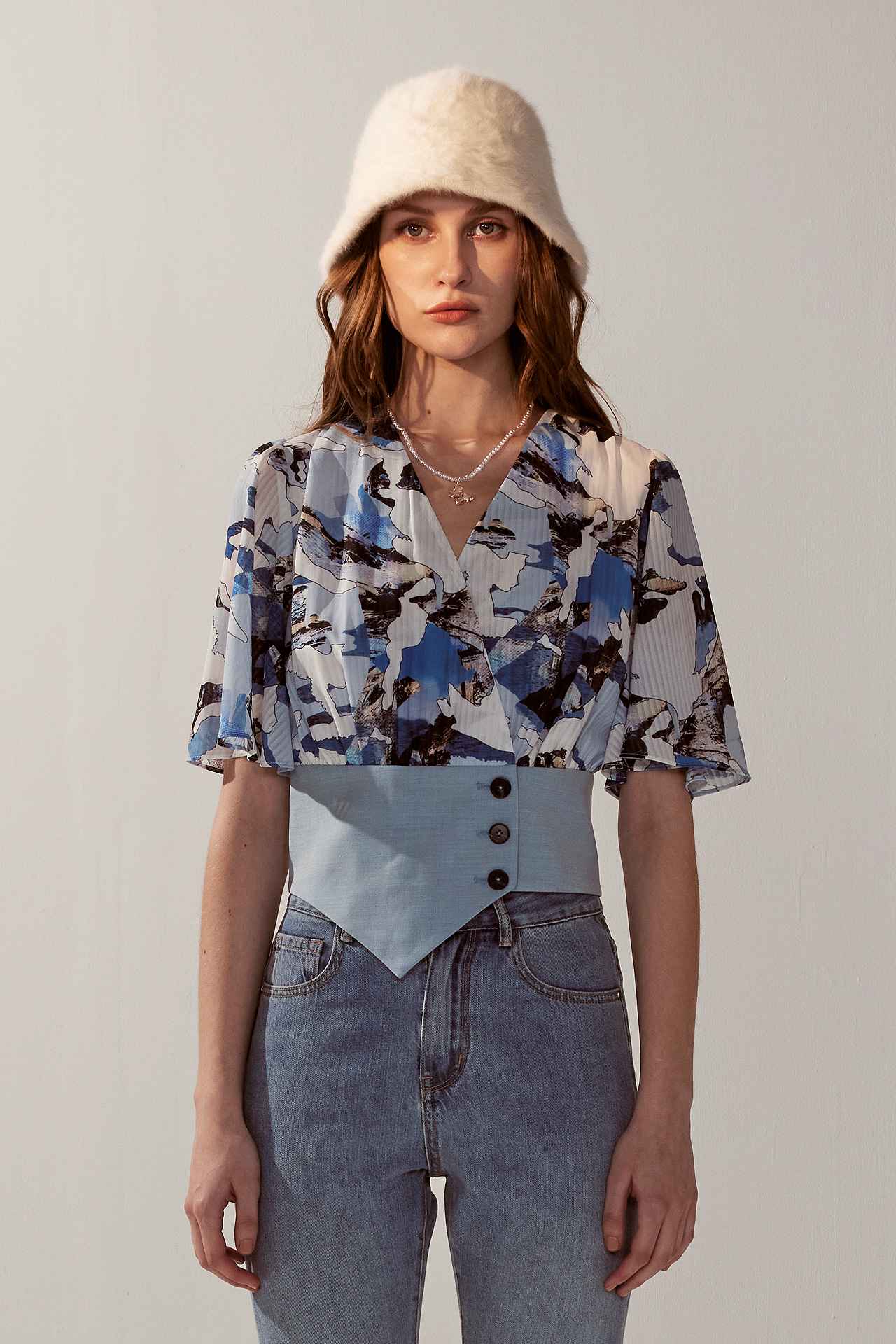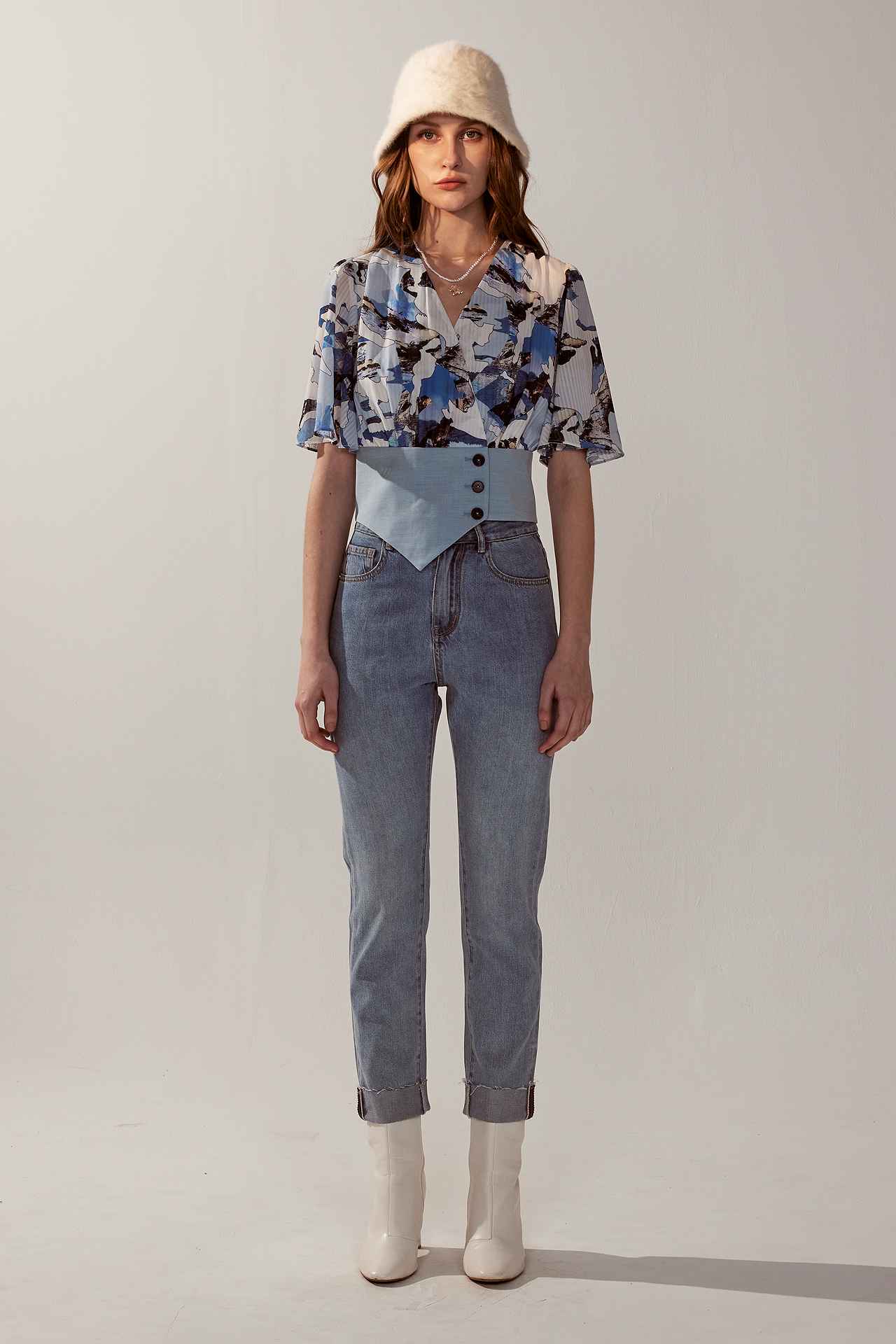 風景印花背心式荷葉袖V領上衣 | JZNANA時尚購物集合