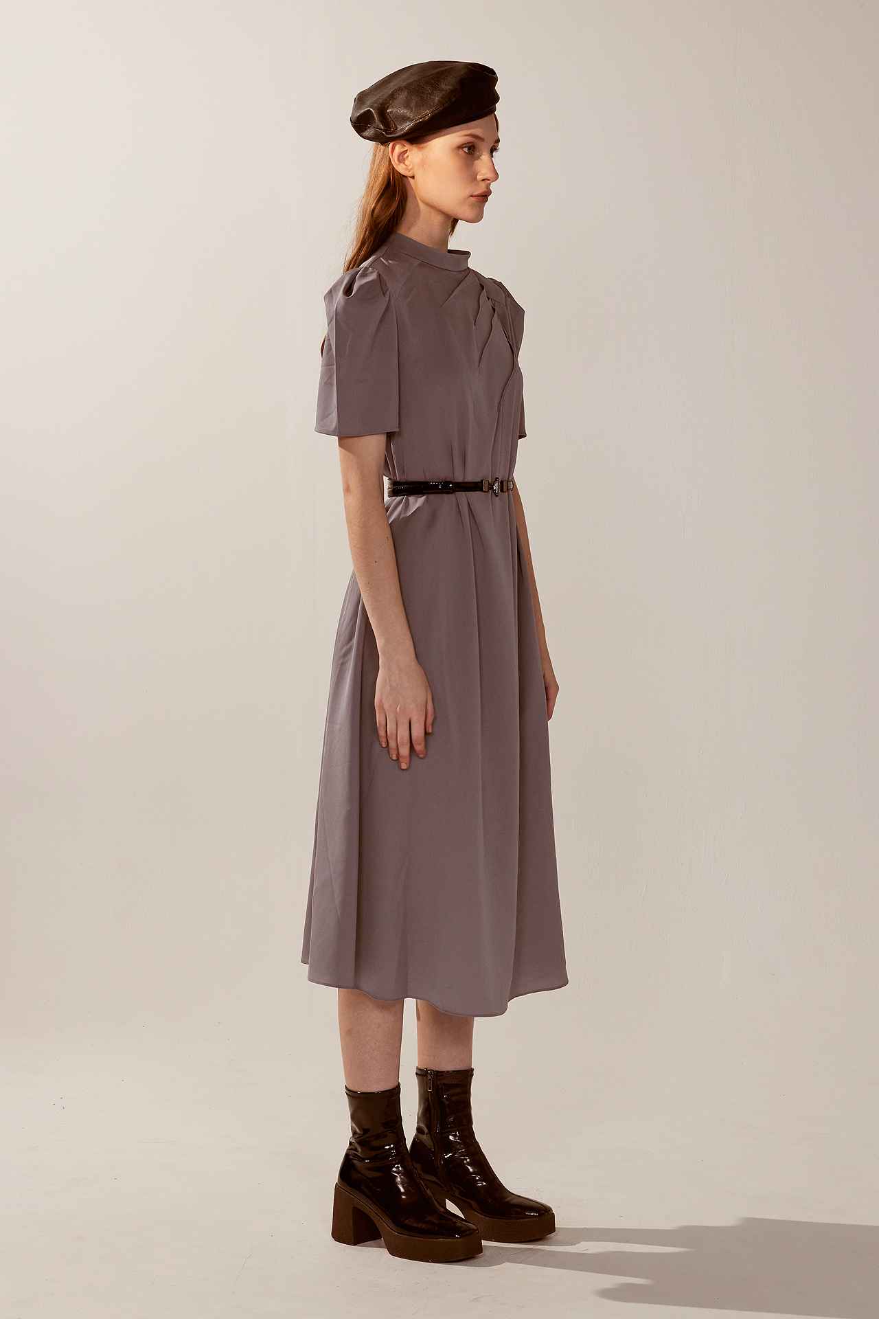 知性簡約紋理小澎袖寬鬆洋裝(附腰帶)