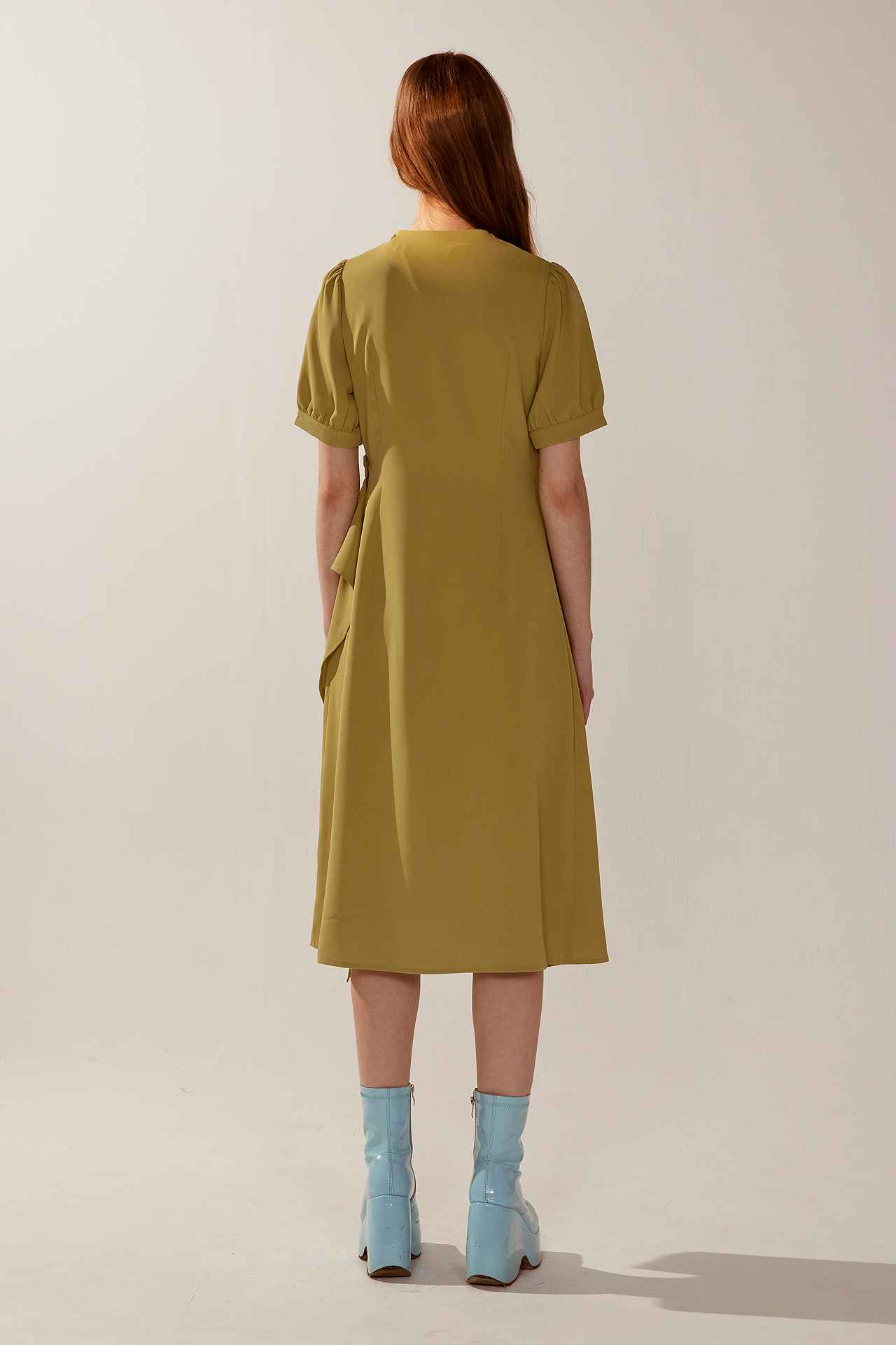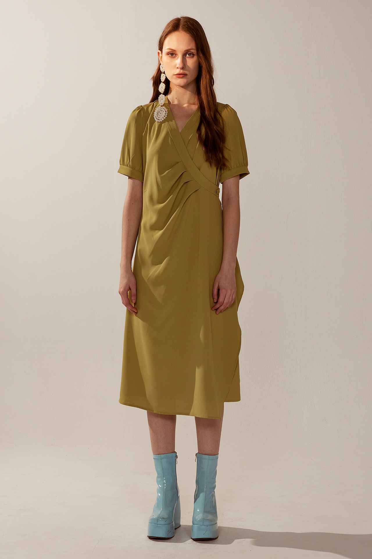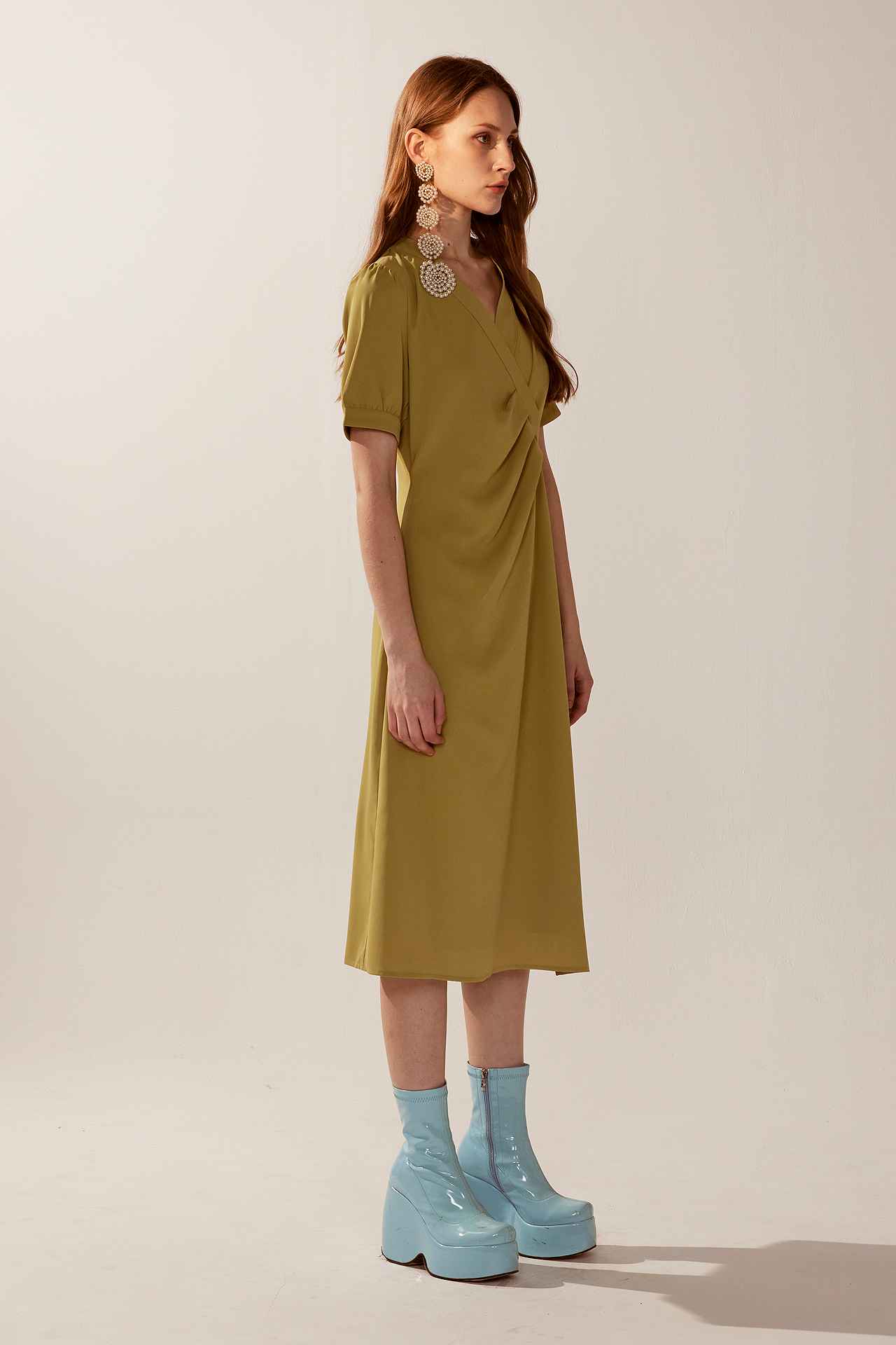 法式不規則V領垂墜感褶面短袖洋裝