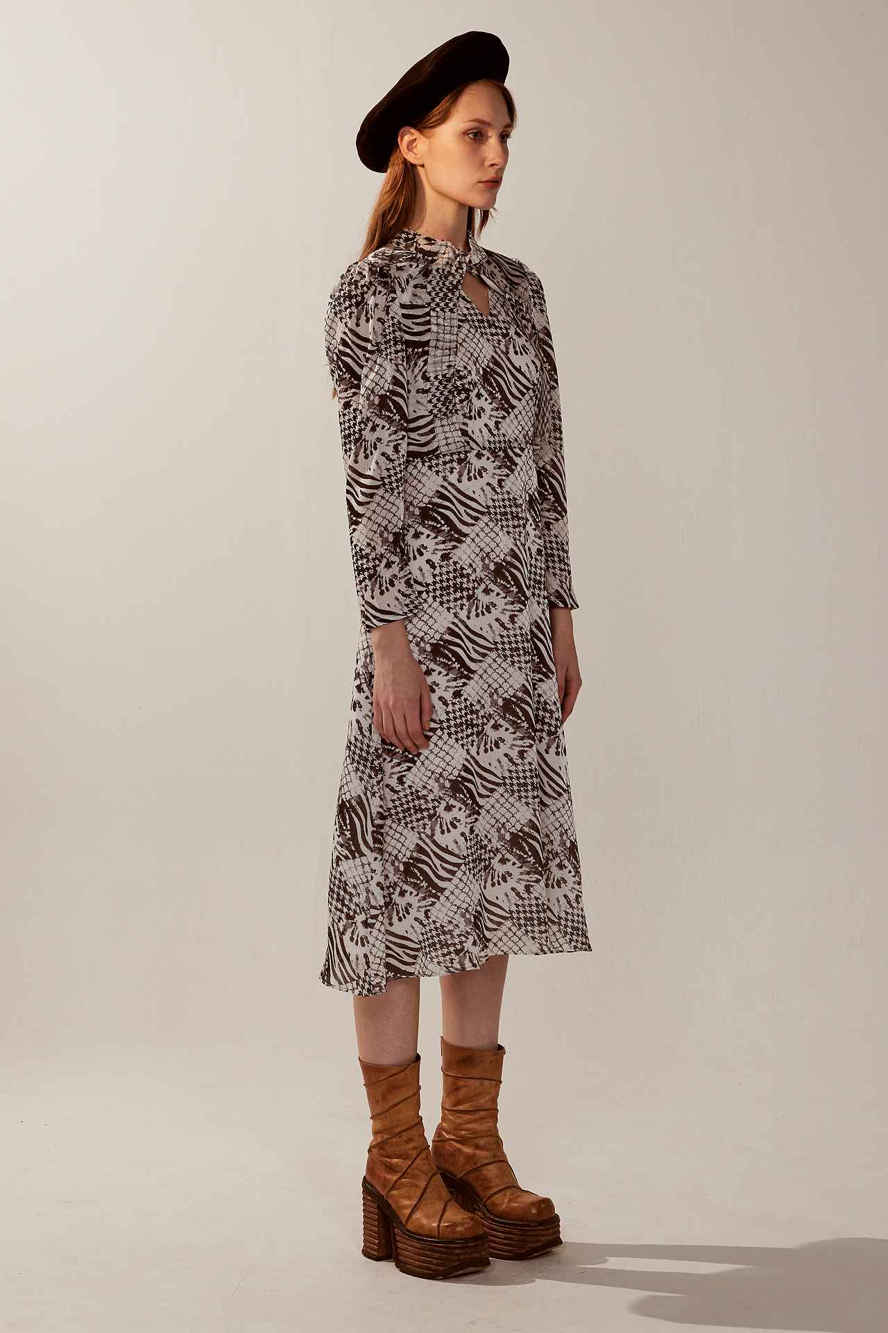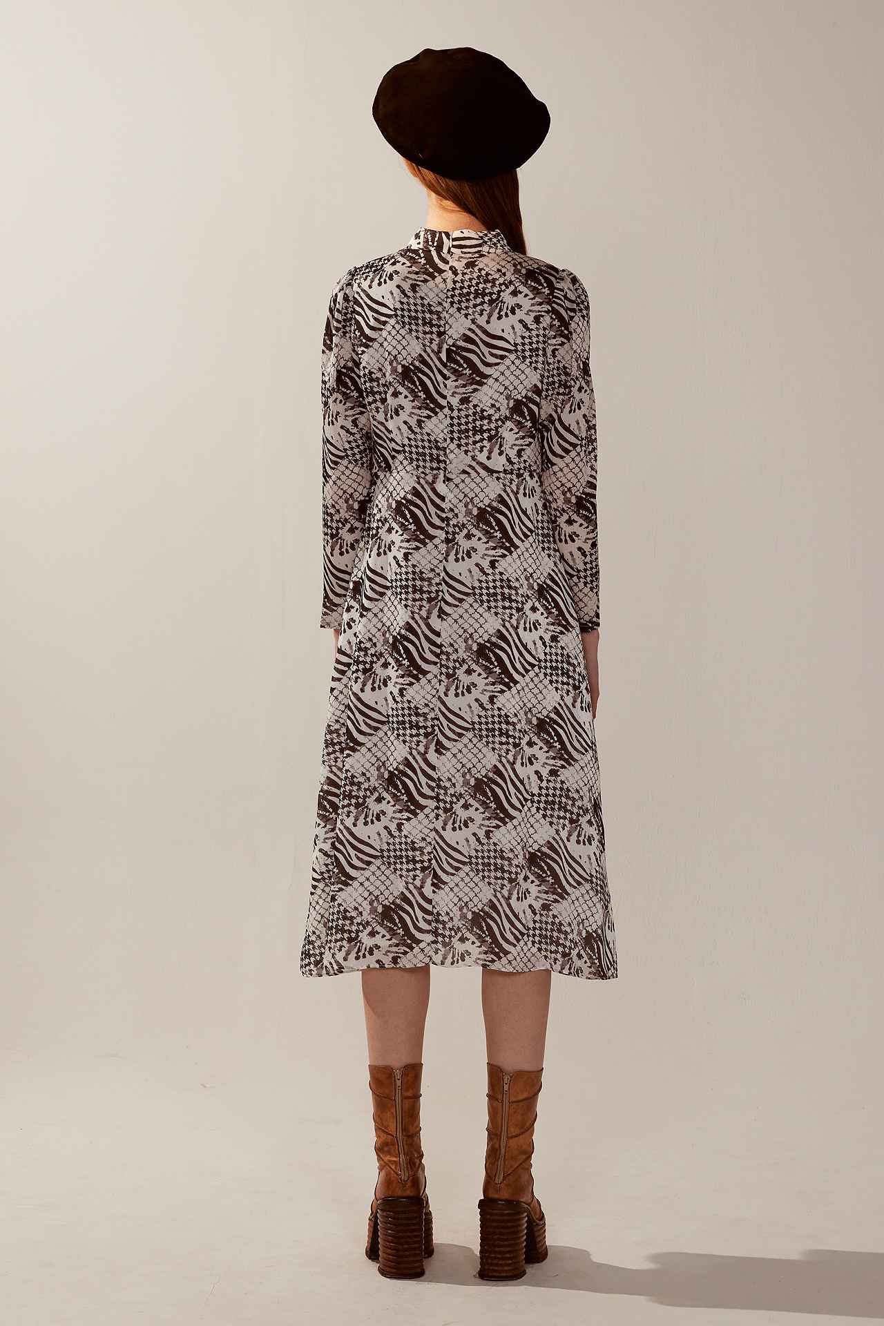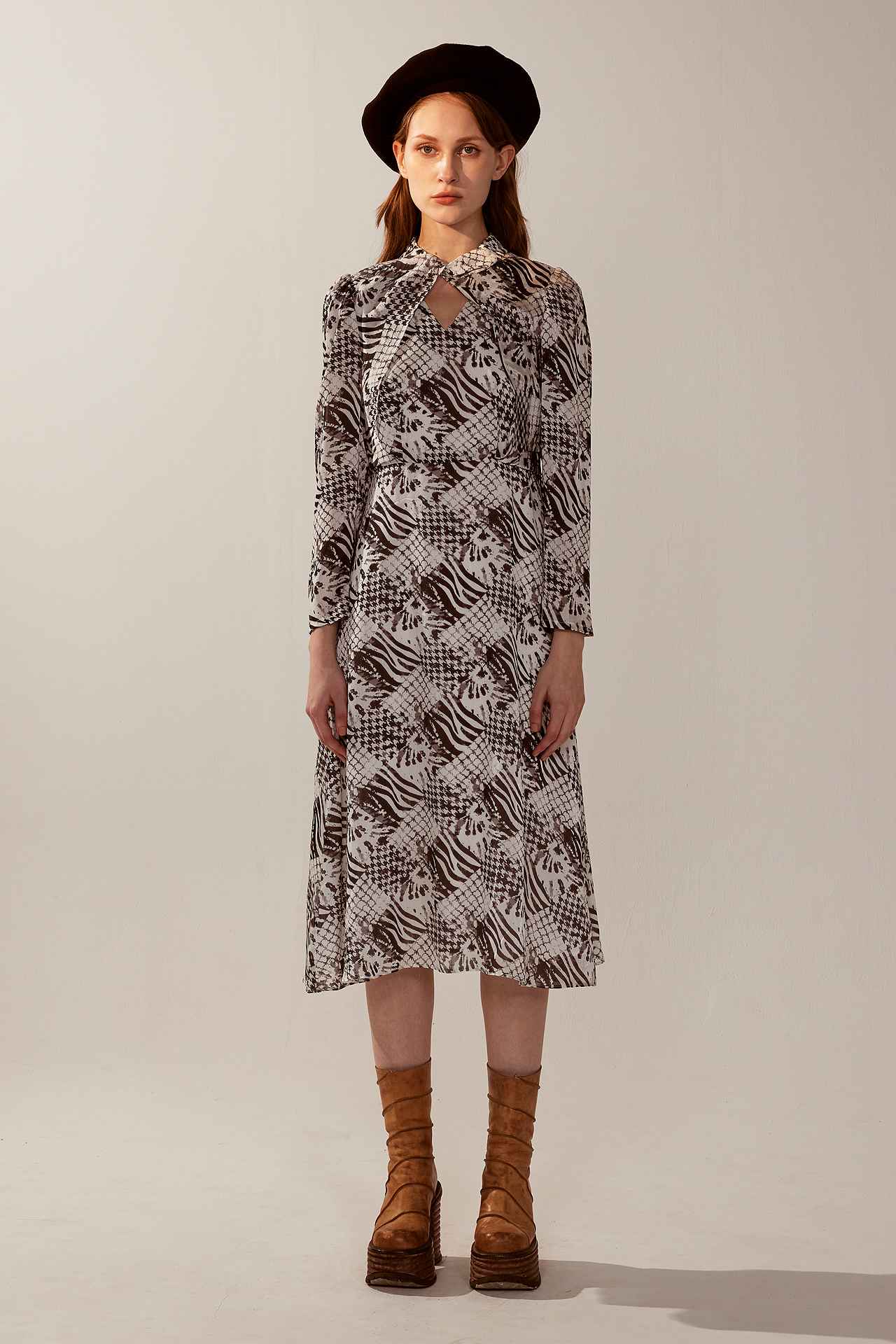 法式黑白印花扭結V領長袖洋裝 | JZNANA時尚購物集合